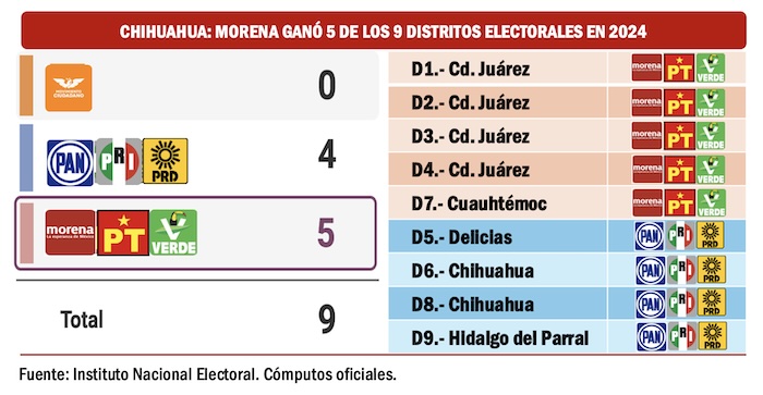 Tres años después, en 2024, el escenario es totalmente diferente pues Morena y sus aliados ganaron 5 de los 9 distritos electorales del estado, incluyendo los cuatro que tienen cabecera en Ciudad Juárez, la ciudad más poblada de Chihuahua, que concentra el 40 por ciento de los habitantes de la entidad.