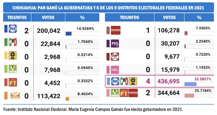 En Chihuahua, donde gobierna la panista María Eugenia Campos Galván, se observa un desgaste de la fuerza albiazul entre 2021 y 2024. En los comicios federales del 2021 la coalición panista ganó 6 de los 9 distritos electorales federales de la entidad.