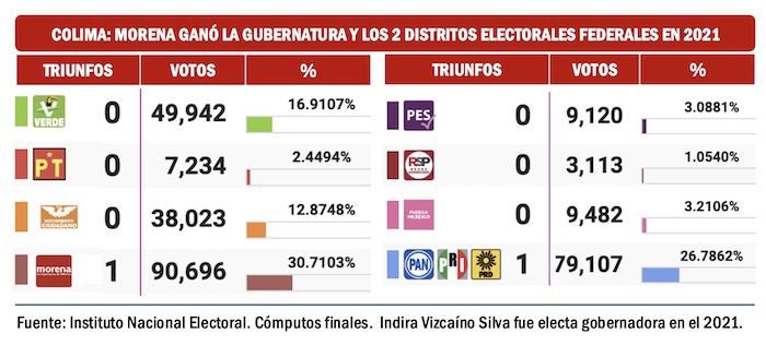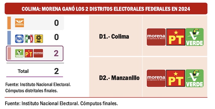 En Colima tampoco parece haber riesgo en la disputa de la gubernatura que Indira Vizcaíno Silva ganó en el 2021. En los dos procesos federales en los cuales se han disputado los dos distritos de la entidad, en ambos casos, 2021 y 2024, Morena y sus aliados han ganado con comodidad. Una alianza PAN-Movimiento Ciudadano podría poner alguna presión a la coalición oficialista en el 2027.