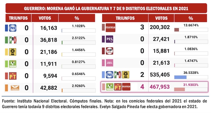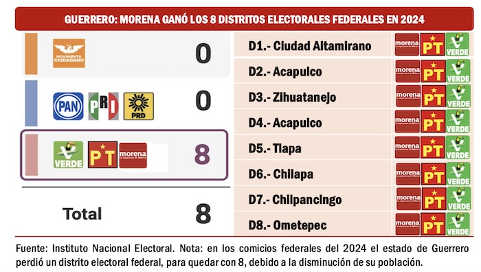 En Guerrero tampoco se observan riesgos para Morena. En 2021, cuando Evelyn Salgado Pineda ganó la gubernatura, la coalición oficialista se llevó el triunfo en 7 de 9 distritos electorales federales. En 2024 Morena y sus aliados consolidaron su supremacía electoral y ganaron los 8 distritos electorales en disputa.