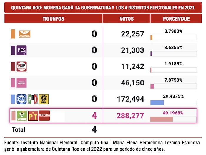 Los cuatro distritos electorales federales de Quintana Roo fueron ganados por Morena y sus aliados en los comicios del 2021 y 2024. Fue en 2022, para un periodo de cinco años, que María Elena Hermelinda Lezama Espinoza ganó cómodamente la gubernatura.