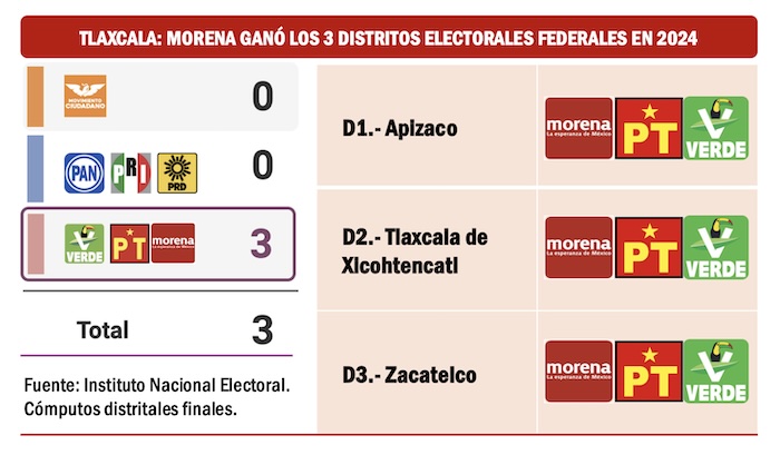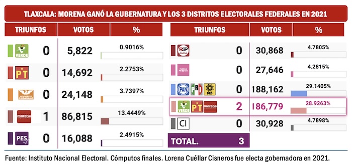 En Tlaxcala el escenario es muy favorable para Morena. Sin sobresaltos la coalición oficialista ganó los tres distritos electorales federales tanto en 2021 como en 2024. Y también en 2021 ganó la gubernatura Lorena Cuéllar Cisneros.
