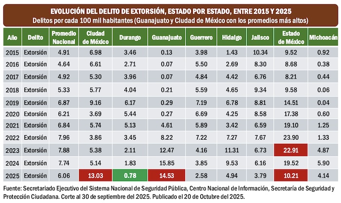 La más reciente Encuesta Nacional de Victimización y Percepción sobre Seguridad Pública (ENVIPE) 2025 realizada por el Instituto Nacional de Estadística y Geografía, publicada el 18 de septiembre del 2025, estima en 3 mil 467 millones de pesos el dinero que se pagó por extorsiones, de toda naturaleza, durante 2024.