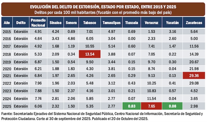 Los estados de la República que tienen los más bajos índices de delitos de extorsión por cada 100 mill habitantes son Yucatán, con 0.08, Durango, con 0.78 y Tlaxcala, con 0.83 según datos del Secretariado Ejecutivo del Sistema Nacional de Seguridad Pública, correspondiente a enero-septiembre del 2025.