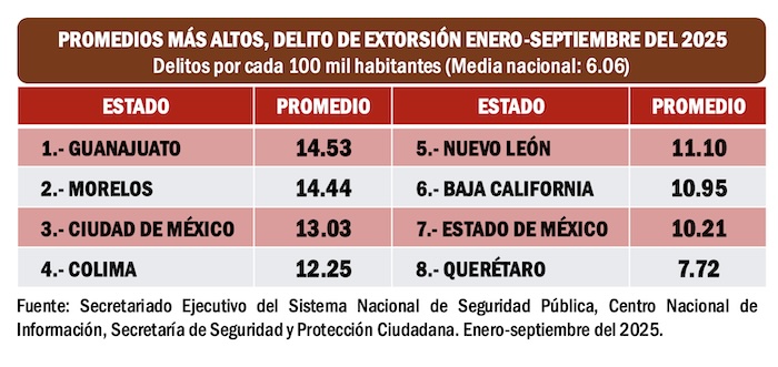 Otros estados del país con altos índices de extorsiones en Morelos y Nuevo León, que han experimentado este problema delictivos en los tres años recientes.