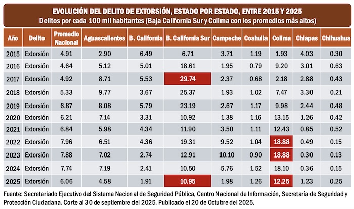 Hay algunas entidades del país en las cuales se ha experimentado un sensible descenso en los índices de extorsiones. Como es el caso de Baja California Sur, que en 2017 registró 29.74 casos de extorsión por cada 100 mil habitantes y en 2025 presenta 10.95 casos por la misma proporsión de habitantes.