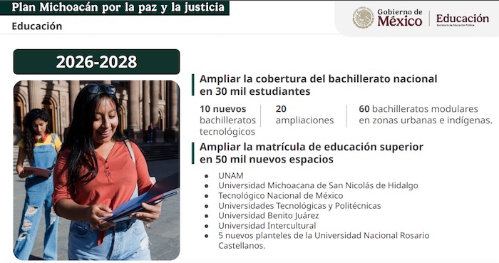 Como parte del Plan de Paz y Justicia de Michoacán, el Gobierno federal extenderá programas destinados a disminuir los factores de riesgo que hacen que los jóvenes se unan a grupos criminales: 6 mil 300 millones de pesos en 2026 para más de 800 mil becas a estudiantes y 130 mil mdp a más de 1 millón 070 mil beneficiados de programas de bienestar, entre ellos, 114 mil niños y niñas, así como polos de desarrollo en Morelia, Uruapan y puerto Lázaro Cárdenas, y el desarme voluntario.