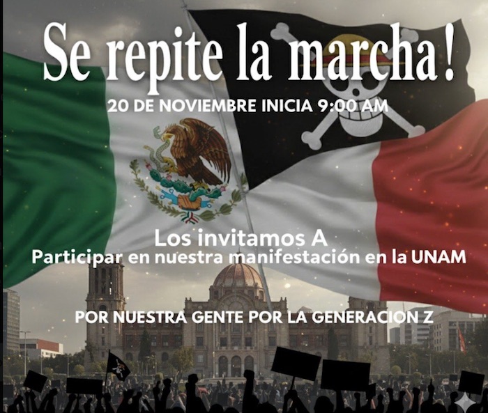 Este jueves 20 de noviembre, la cuenta de X de "Generación Z México" está convocando a una segunda manifestación en el Ángel de la Independencia y otras ciudades del país, a la par de que la Sedena realizará el desfile militar por el aniversario de la Revolución Mexicana, por primera vez, ajustando la ruta del Zócalo de la CDMX al Monumento a la Revolución.