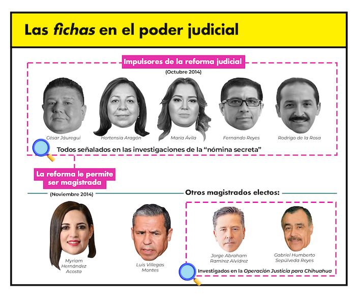 La coreografía de fichas en el Poder Judicial llevaba la huella del duartismo: Myriam Hernández fue nombrada Magistrada gracias a una reforma de octubre de 2014, impulsada por los legisladores Rodrigo de la Rosa Ramírez, César Jáuregui Moreno, María Ávila Serna, Hortensia Aragón Castillo y Fernando Reyes Ramírez, todos señalados en las investigaciones de la “nómina secreta”, un esquema de sobornos en efectivo entregados por orden de Duarte a personajes públicos.