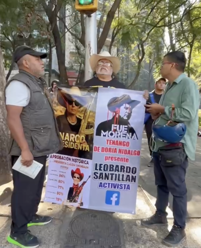 A las 10:30 de la mañana apenas unas 20 personas vestidas de blanco eran visibles en el Ángel. Como el día sábado, algunos acudieron con sombreros y pancartas con la leyenda "Narcopresidenta". En el lugar mayor la presencia de fuerzas del orden y de Protección Civil.