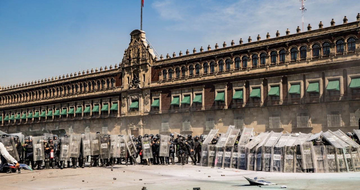 Por avenida 5 de mayo, el contingente logró llegar hasta calle Palma, a una calle de la plancha del Zócalo de la CDMX, donde volvieron a encontrar una valla humana de policías con escudos de plástico.