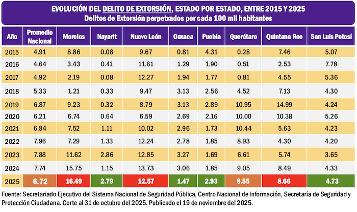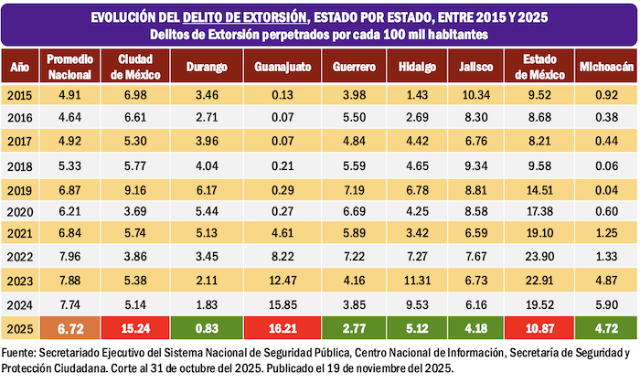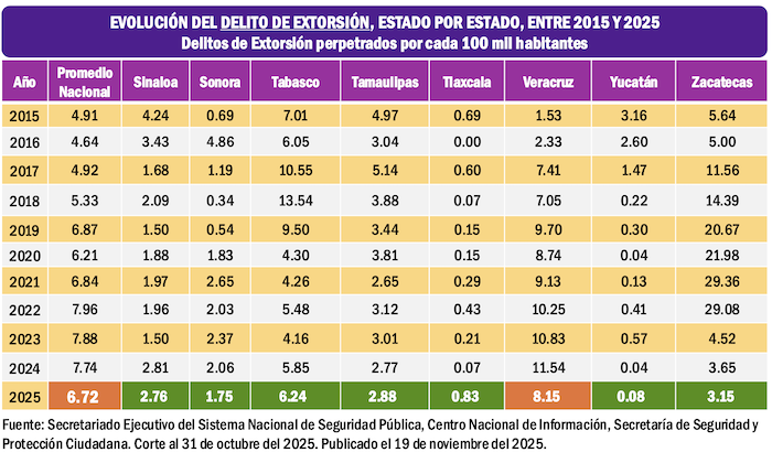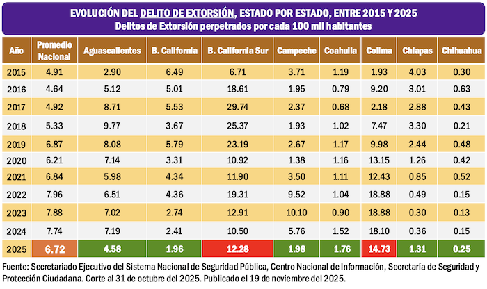 El pasado 6 de julio del 2025 la Secretaría de Seguridad y Protección Ciudadana anunció la estrategia nacional contra el delito de extorsión, y tres meses después, en el cierre del mes de octubre, 22 entidades del país están por debajo del promedio nacional de casos por cada 100 mil habitantes, ocho están por encima del promedio y dos se mantienen prácticamente en el mismo rango.