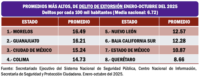 Desgraciadamente Morelos encabeza la lista de las entidades más agobiadas por los extorsionadores, con un alto promedio de 16.49 casos por cada 100 mil habitantes, seguido por Guanajuato, Ciudad de México y Colima.