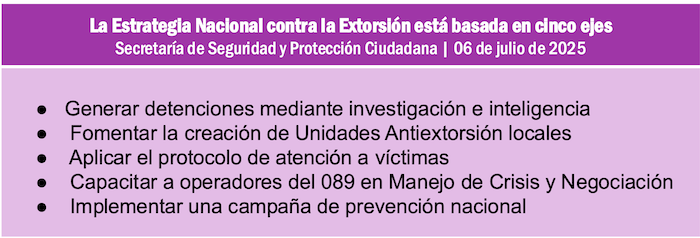 Las cifras del cierre de octubre se registran tres meses después de que la Secretaría de Seguridad y Protección Ciudadana anunció la estrategia nacional contra el delito de extorsión, la cual está basada en cinco ejes: