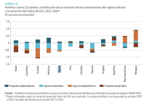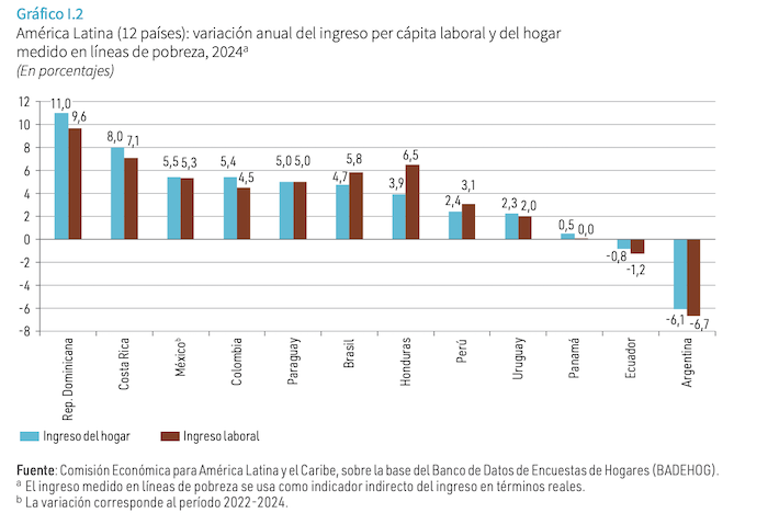 El reporte menciona, por ejemplo, cómo en Argentina, la contribución del empleo asalariado al incremento de la pobreza fue de 1,4 puntos porcentuales, lo que representó 3,2 veces la suma de los aportes del trabajo independiente, las pensiones y otros ingresos. Mientras que en Panamá, que también registró incrementos en la pobreza y la pobreza extrema entre 2023 y 2024, los sueldos y salarios fueron igualmente la corriente de ingresos que más contribuyó al aumento de la pobreza.
