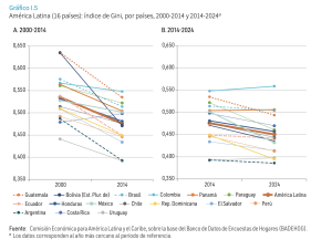 La CEPAL expone que la variación anual del ingreso per cápita laboral y del hogar, medido en líneas de pobreza, en México fue de 5.3 y 5.0 por ciento, respectivamente, en 2024. Los mismos datos muestran que entre 2023 y 2024, México registró una caída en el índice de Gini de al menos un 2 por ciento. El índice de Gini, según las encuestas de hogares, fue de 0.441 en 2022.