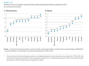 El reporte expone que América Latina alcanzó su tasa de pobreza monetaria más baja registrada desde que existen datos comparables en 2024, situándose en el 25.5 por ciento de la población regional, lo que significó una disminución de 2.2 puntos porcentuales respecto a 2023 y más de 7 puntos porcentuales en comparación con 2020. La fuente de ingreso que más impactó en las variaciones de la pobreza en todos los países, tanto en su reducción como en su aumento, fue el ingreso del trabajo asalariado