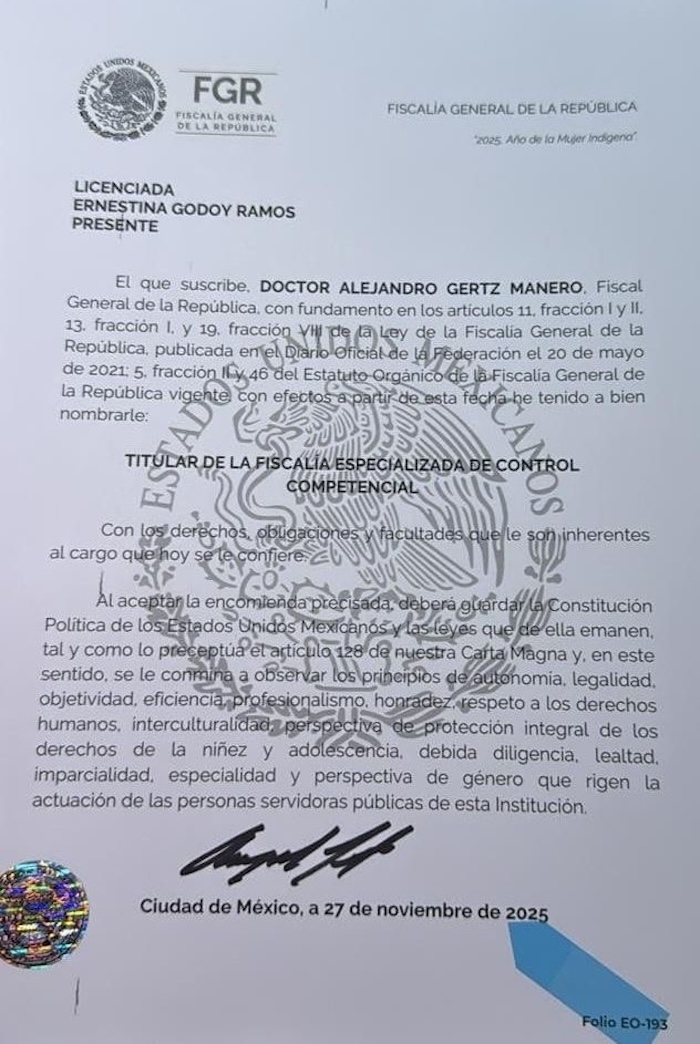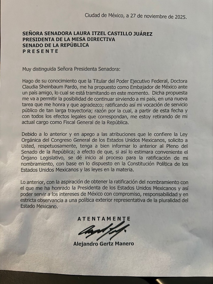 A través de una carta dirigida a Laura Itzel Castillo Juárez, presidenta del Senado de la República, Gertz Manero informó que se separa de su cargo como Fiscal General tras aceptar la invitación de la Presidenta Claudia Sheinbaum de ser Embajador en otro país, el cual no especificó.