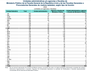 De acuerdo con las cifras del Inegi, en el año 2024 existían en todo el país 4 mil 580 unidades administrativas y agencias o fiscalías del Ministerio Público, de las cuales únicamente 165 pertenecían a la Fiscalía General de la República, mientras que 4 mil 415 correspondían a las fiscalías y procuradurías estatales, un contraste significativo que confirma la enorme asimetría operativa entre la institución federal y las entidades, la cual tiene su justificación ya que las fiscalías estatales atienden delitos del fuero común, que son mayores, y la FGR atiende delitos del fuero federal, que tienden a ser menos. Es por ese motivo que el hecho de que la FGR concentre un mayor porcentaje de carpetas cerradas sin ejercer acción penal sobre las estatales, es muy notoria.