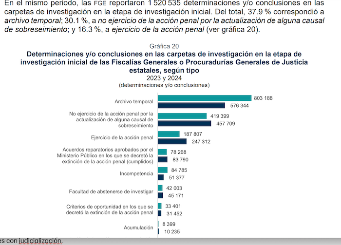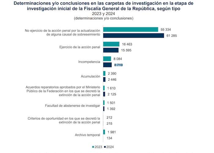 Al comparar las cifras con el año anterior el crecimiento es evidente: en 2024 se registraron 61 mil 285 determinaciones de no ejercicio penal, frente a 55 mil 334 en 2023. En contraste, las carpetas que sí derivaron en ejercicio penal disminuyeron: 15 mil 595 concluyeron con judicialización en 2024, mientras que en 2023 fueron 16 mil 463. Es decir, mientras aumentó el no ejercicio penal, disminuyeron las determinaciones que llevaron a un proceso ante un juez.