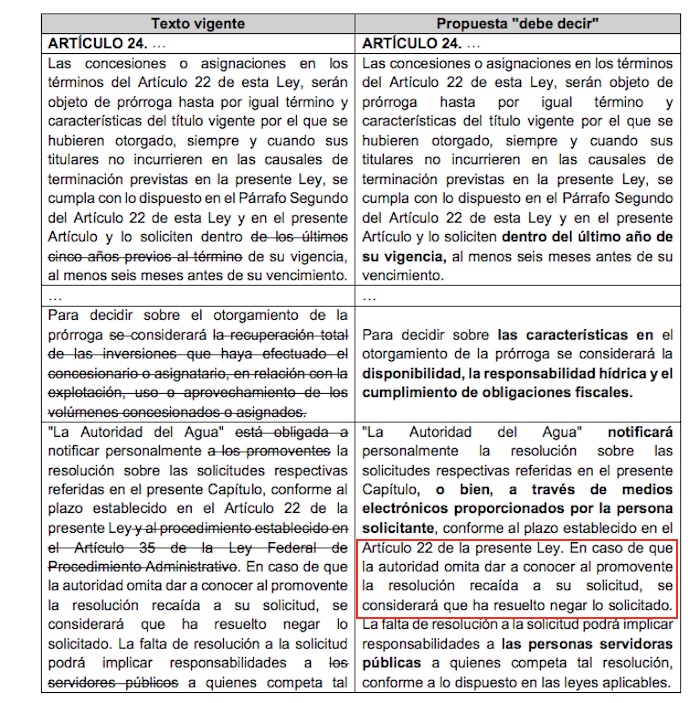 Para Elena Burns, exsubdirectora de Administración en la Conagua, el punto más grave es eliminar la "negativa ficta" del artículo 24 de la Ley Nacional de Aguas, es decir, si alguien solicita una concesión y la Conagua no alcanza a responder en 60 días por el acumulado de solicitudes, se daría en automático sin considerar la disponibilidad en el acuífero.
