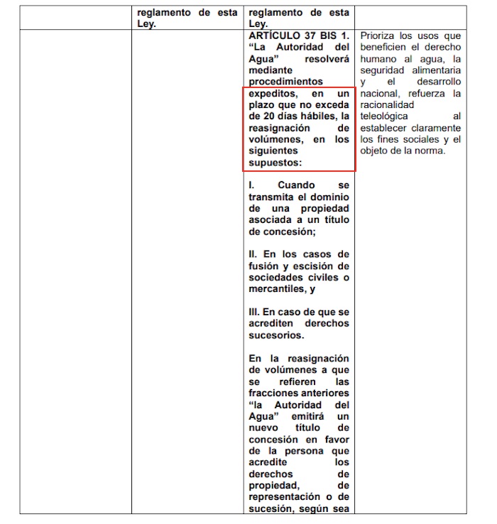A pesar de la prohibición general de la transmisión, la iniciativa crea un procedimiento específico para asegurar la continuidad de los derechos en ciertos casos, incluida la herencia. Este proceso se denomina reasignación de volúmenes. El artículo 37 BIS I de la propuesta establece que "La Autoridad del Agua" resolverá la reasignación de volúmenes mediante procedimientos expeditos (en un plazo no mayor a 20 días hábiles) cuando se acrediten derechos sucesorios, cuando se transmita el dominio de una propiedad asociada a un título de concesión, entre otros.