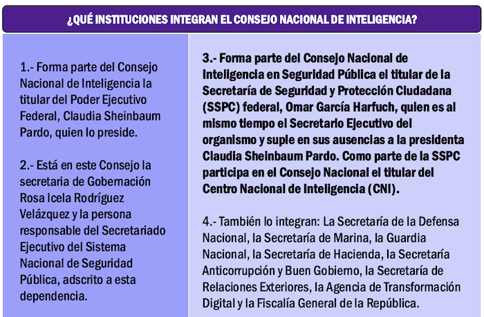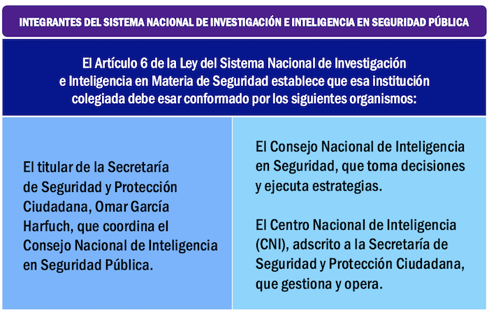 Agrega la reforma constitucional al Artículo 21: “Le corresponderá [a la Secretaría de Seguridad y Protección Ciudadana] la coordinación del Sistema Nacional de Inteligencia en Materia de Seguridad Pública (…) y podrá coordinar las acciones de colaboración de los tres órdenes de gobierno, a través de las instituciones de seguridad pública, los cuales además deberán de proporcionar la información de que dispongan o que recaben (…). Podrá solicitar información a las instituciones y dependencias del Estado para la identificación y esclarecimiento de los hechos presuntamente constitutivos de delitos”.