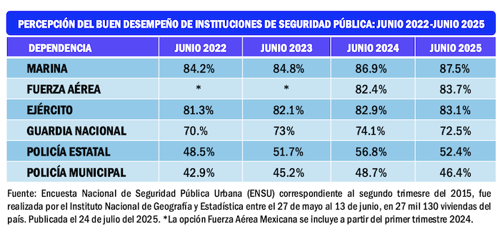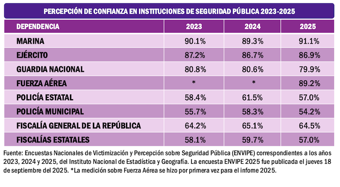 En campo, la coordinación para el combate a la delincuencia organizada tiene el soporte que le ofrece la Fuerza Armada Permanente, que conserva muy buenas mediciones en cuanto a la confianza que despierta en los ciudadanos y la eficacia que la gente observa en su trabajo.