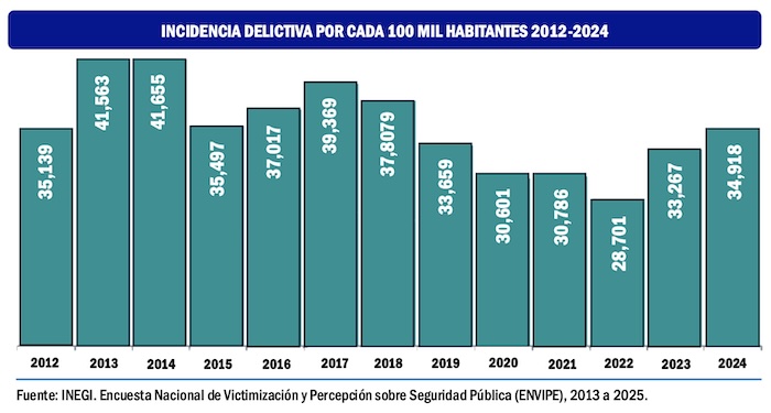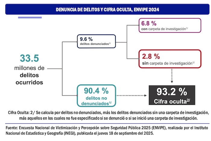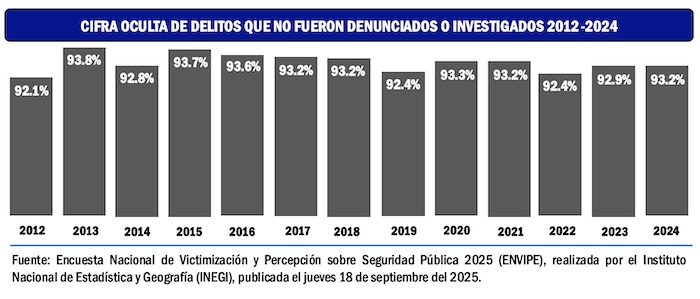Durante 2024 se cometieron en México 33.5 millones de delitos, de los cuales quedaron impunes el 93.2 por ciento, por muy diversas causas atribuibles, mayormente, a la desconfianza de las personas en la autoridad. Lo que ha derivado que en los últimos 13 años la cifra negra de delitos prácticamente no ha descendido.