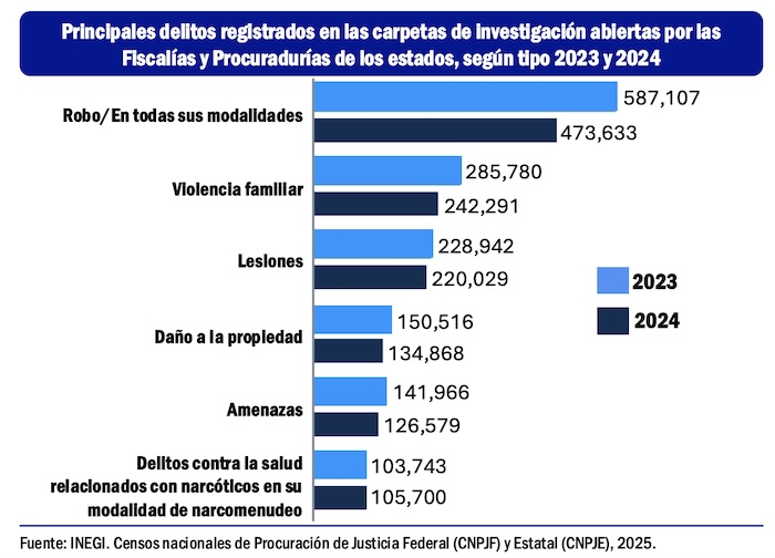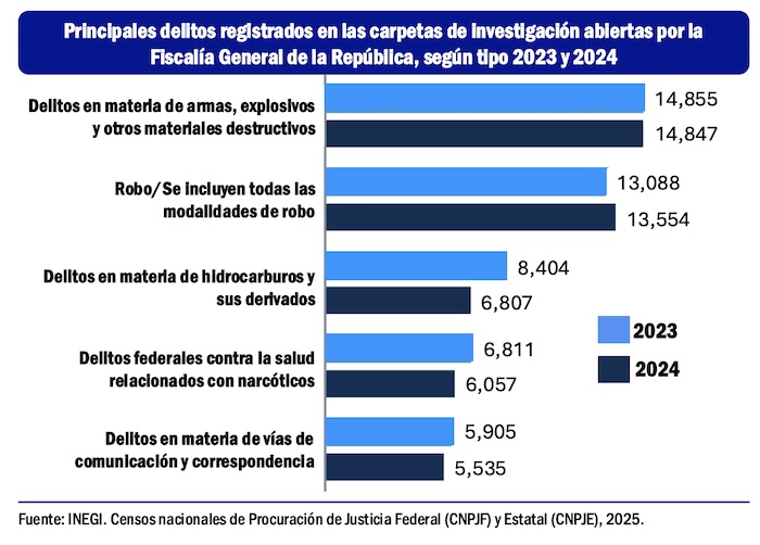 En el ambito federal el delito más frecuente es en materia de armas de fuego y explosivos, en tanto que en el ámbito del fuero común, que atienden las fiscalías y procuradurías estatales, sobresale el robo en todas sus modalidades.