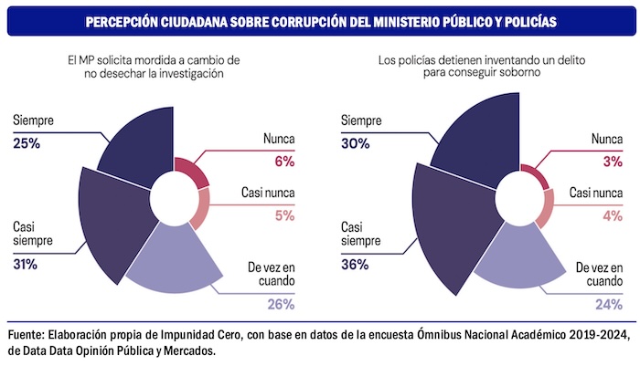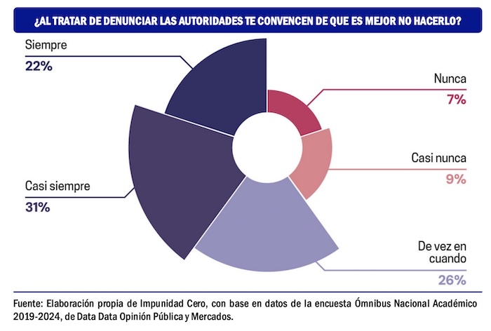 Advierte el informe de Impunidad Cero que desde 2022 hasta 2024, de manera consistente son más las personas que consideran que la impunidad se ha mantenido o aumentado, que quienes perciben una disminución. En 2024, el 43 por ciento de las personas afirmó que el nivel de impunidad se ha mantenido, el 40 por ciento respondió que va en aumento y sólo el 14 por ciento opinó que ha disminuido. Estas conclusiones se apoyan en la encuesta Ómnibus Nacional Académico, realizada por la consultora Data Opinión Pública y Mercados. Se llevaron a cabo 1,424 entrevistas a personas de 18 años y más, entre el 8 de noviembre y el 8 de diciembre de 2024, en hogares, cara a cara.