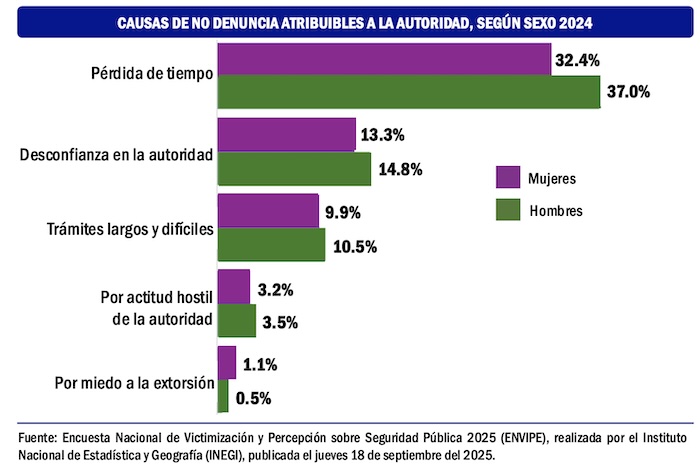 ¿Cuáles son las causas por las cuales no denuncia la gente? Porque considera que acudir ante la autoridad es una pérdida de tiempo; porque desconfía de la autoridad; porque estima que los trámites son largos y difíciles, entre las principales razones.