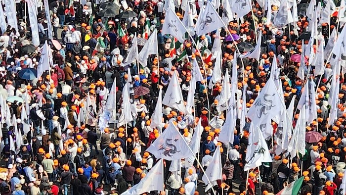 El escenario estaba compuesto por banderas, mantas, lonas y globos. Los contingentes organizados mostraban su peso dentro del movimiento. Uno de los más vistosos fue la SNTE, que apareció en bloque: vestidos de naranja, con banderas en alto, ocuparon casi una cuarta parte de la plancha. Las banderas permitían identificar grupos.