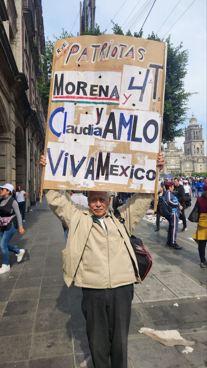 Fausto Galicia, de 85 años, viajó desde Puebla con una gran cartulina en apoyo a la mandataria. “Vine a compartir como todos los mexicanos el apoyo a nuestra doctora Claudia Sheinbaum Pardo y recordar al hombre Andrés Manuel López Obrador, el fundador del Movimiento de Regeneración Nacional y la Cuarta Transformación. Por eso vine a apoyar. No es la primera vez, siempre vengo aquí a este tipo de eventos. Apoyar es mi manera de manifestarme”.