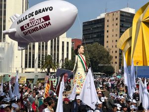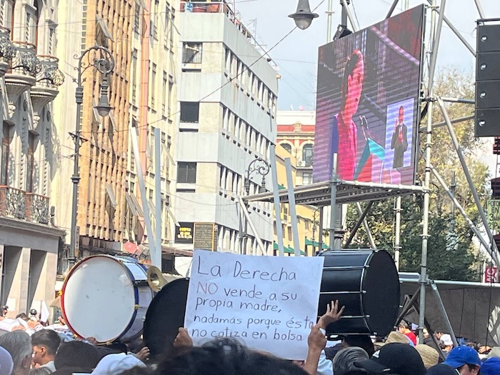 Entre las calles aledañas a la plancha del Zócalo capitalino como Madero, Palma y 5 de Mayo, los asistentes escuchaban el mensaje desde varias pantallas. Además de una segunda escultura de la mandataria federal y mujeres portando una manta para agradecer por “la defensa de la soberanía y democracia”, resaltaba un letrero con la leyenda: “traidores” con la fotografía de políticos como Trump, el excandidato presidencial de ultraderecha Eduardo Verástegui, del dirigente priista Alejandro “Alito” Moreno Cárdenas, de Ricardo Anaya, así como de comunicadores como Javier Alatorre, Brozo, Carlos Alazraki, Carlos Loret de Mola y Ciro Gómez Leyva.