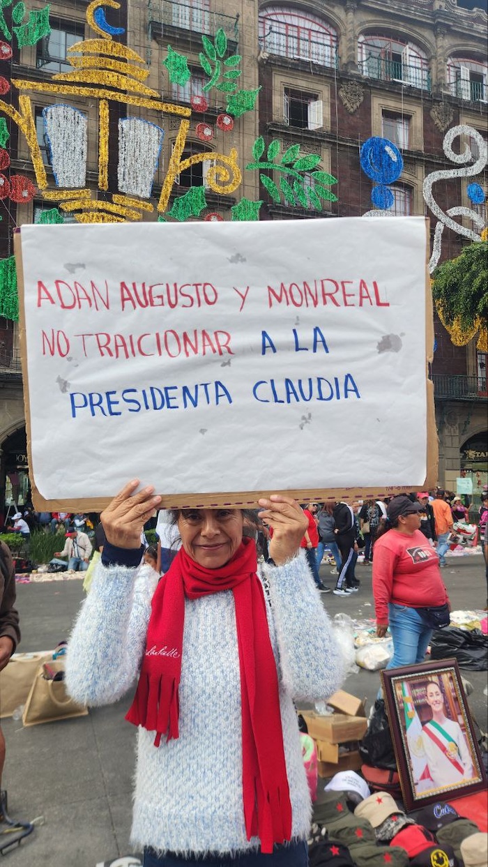 De igual forma, algunos activistas y simpatizantes, como Noemí, proveniente de Morelos, acudieron al Zócalo no solo para apoyar a la Presidenta, sino para advertirle sobre figuras internas que consideran un riesgo. Noemí portaba una cartulina dirigida a Ricardo Monreal y Adán Augusto, manifestando: "Adán Augusto y Adán. No traicionar a la Presidenta". Argumentó que "Augusto y Monreal son un obstáculo" para los proyectos de Sheinbaum. El mensaje de las bases es que, para que el cambio "dure más y no sea desinstalado pronto", es necesario "vigilar qué está pasando" desde adentro.