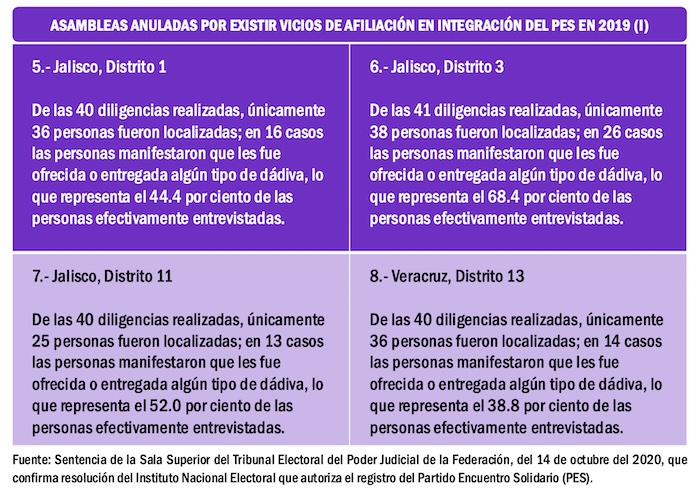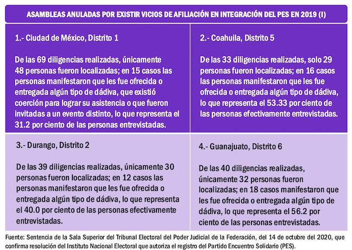 Estas irregularidades motivaron que la Dirección Ejecutiva de Prerrogativas a Partidos Políticos del INE ordenará visitas aletorias 10 por ciento de las personas afiliadas de manera válida y que asistieron a las asambleas del PES. Con motivo del estudio de las actas levantadas en cada una de las diez asambleas referidas, se llegó a la conclusión de que deberían declararse inválidas ocho de ellas, al existir vicios en la afiliación.
