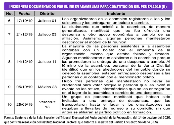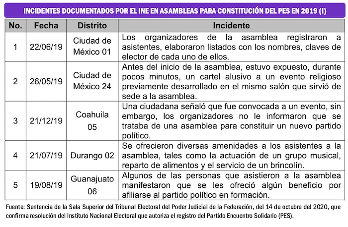 La Sala Superior del Tribunal Electoral del Poder Judicial de la Federación reconoció que en las inspecciones realizadas por personal del Instituto Nacional Electoral se identificaron diez asambleas con incidentes graves como los siguientes: Antes del inicio de la asamblea, estuvo expuesto, durante pocos minutos, un cartel alusivo a un evento religioso previamente desarrollado en el mismo salón que sirvió de sede a la asamblea; algunos de las personas que asistieron a la asamblea manifestaron que se les ofreció algún beneficio por afiliarse al partido político en formación; en varias de las asambleas fiscalizadas hubo personas que admitieron haber asistido con la promesa de recibir a cambio una despensa.