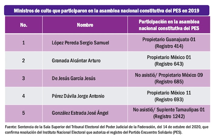 Además, expresó el PAN que de las investigaciones llevadas a cabo en 2020 por la Dirección General de Asociaciones Religiosas de la Secretaría de Gobernación, así como de las que realizó el INE, se acreditó la participación de quince asociaciones religiosas (evangélicas) en la formación del PES. También refiere qué ministros de culto participaron como presidentes, secretarios, delegados de asambleas; auxiliares para la recolección de afiliaciones; realizaron aportaciones económicas, o bien eran militantes afiliados. El Partido Acción Nacional manifiestó su inconformidad porque a la organización Encuentro Solidario se le otorgó su registro como partido político a pesar de vulnerar el principio constitucional del Estado Laico y de la separación Estado-Iglesia y mezclar política con religión, lo cual contraviene el principio de laicidad.