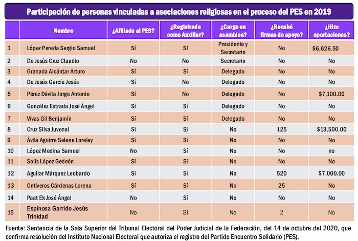 La magistrada Otálora Malassis hizo la siguiente ponderación: “El INE analizó la información proporcionada por la Dirección General de Asociaciones Religiosas y la contrastó con la que integraba el expediente de la solicitud de registro del Partido Encuentro Solidario. Del cruce de datos, se identificaron quince coincidencias en los siguientes términos: 11 personas con investidura religiosa se encuentran afiliadas al PES: 12 personas con investidura religiosa fungieron como auxiliares para recabar apoyo: 7 personas con investidura religiosa ocuparon cargos en el desarrollo de las asambleas estatales; 3 personas con investidura religiosa recabaron apoyos por medio de la aplicación del INE por un total de 647 registros; 4 personas con investidura religiosa realizaron aportaciones económicas a la organización; esa participación se dio en 10 distritos”.