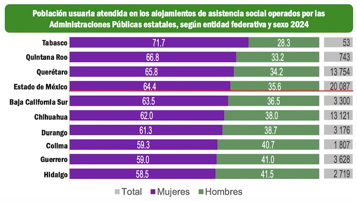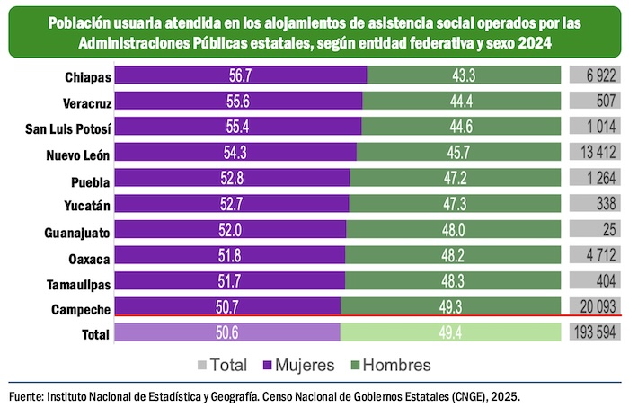 Durante 2024, se atendió a 193 mil 594 personas usuarias en los alojamientos de asistencia social financiados con recursos generados por los gobiernos estatales. Las mujeres representaron 50.6 por ciento y los hombres, 49.4 por ciento. En las entidades de Morelos, Campeche y México se concentró 43.9 porn ciento de la población atendida.