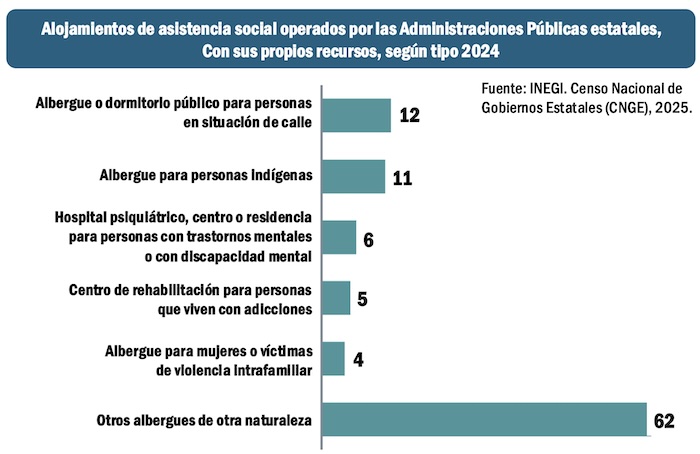 Con respecto a los albergues o dormitorios públicos para personas en situación de calle, el Censo del INEGI apenas registra 12 instituciones de esa naturaleza en todo el país; en tanto que con respecto a hospitales psiquiátricos, centros o residencias para personas con trastornos mentales o con discapacidad mental, financiados con recursos propios de los gobiernos estatales, el INEGI concluye que solo hay 6 en las 32 entidades federativas del país.