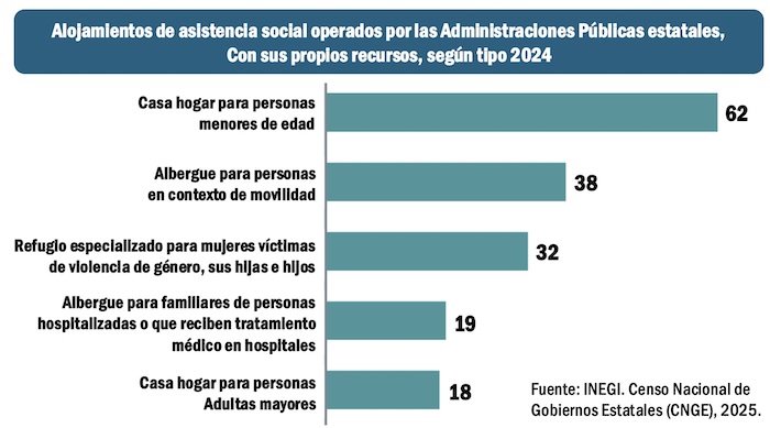 Llama la atención que la mayoría de los gobiernos estatales no pusieron mucha atención en el finaciamiento, con sus propios recursos, de alojamientos especializados para la asistencia social durante 2024. Apenas hubo 62 casas hogar para atención de menores de edad en toda la República financiadas con recursos propios de los gobiernos estatales. Refugios especializados para mujeres víctimas de violencia de género, sus hijas e hijos apenas están registrados 32 en todo el país, financiados con recursos estaales.