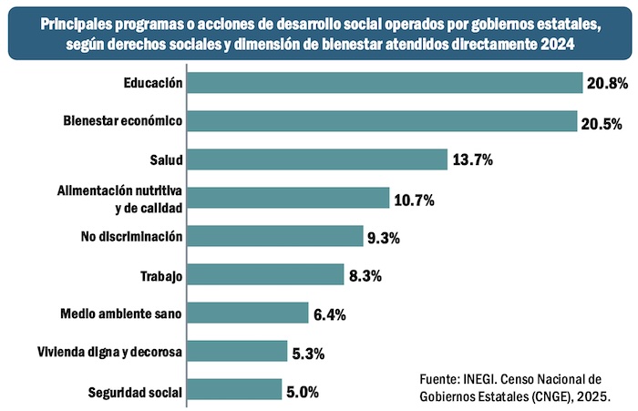 ¿Cuál fue la principal orientación de los programas de desarrollo social promovidos con recursos de los estados? El INEGI registró que el 20.8 por ciento se encauzaron durante 2024 a la educación; en segundo lugar, a apoyos para mejorar el bienestar económico de la población, en un porcentaje del 20.5 por ciento; a programas de salud se orientó el 13.7 por ciento de los recursos públicos generados en las propias entidades federativas.