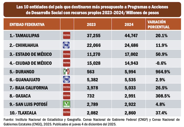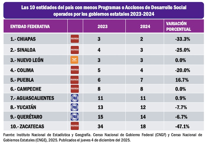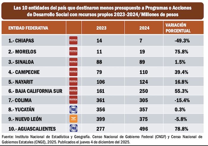El Censo Nacional de Gobiernos Estatales (CNGE), 2025. Publicado por el INEGI el jueves 4 de diciembre del 2025 refleja número que parecen increíbles, como, por ejemplo, que en el estado de Chiapas, en el gobierno del morenista Rutilio Escandón, sólo se hayan invertido en la entidad 7 millones de pesos generados por el gobierno de la entidad en programas de desarrollo social y que en el caso del estado de Morelos, mal administrado por el morenista Cuauhtémoc Blanco Bravo, únicamente se hayan destinado a programas desarrollo social 19 millones de pesos de recursos generados en la entidad durante 2024.