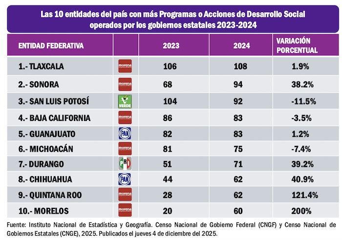 Estos programas o acciones de desarrollo social se refieren a las intervenciones presupuestarias gubernamentales alineadas a alguno de los derechos sociales o dimensión de bienestar económico. Se consideraron los programas o acciones que ejercieron recursos públicos propios de la entidad federativa, aquellos que provienen de los impuestos, derechos, productos y aprovechamientos locales, según registra el Censo Nacional de Gobgierno Estatales 2025, realizado por el Instituto Nacional de Estadística y Geografía, publicados el jueves 4 de diciembre del 2025.