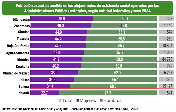 Finalmente el gobierno de Morelos es el que más personas atendió en alojamiento de asistencia social operados con recursos estatales durante 2024, al sumar 44 mil 773 personas protegidas, pero hay entidades con más capacidad económica donde los registros son pobres, como comno Michoacán, con 353 personas socorridas y Jalisco con apenas 536 que recibieron el abrigo de instituciones estatales de asistencia social en el transcurso del año.