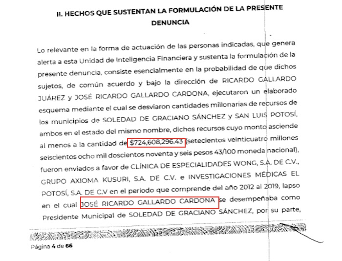 “Se desviaron cantidades millonarias de recursos de los municipios Soledad de Graciano y San Luis Potosí, ambos en el estado del mismo nombre, dichos recursos cuyo monto asciende al menos a la cantidad de 724 millones 608 mil 296 pesos, fueron enviados a favor de Clínica de Especialidades Wong, Grupo Axioma Kusuri e Investigaciones Médicas el Potosí en el periodo que comprende del año 2012 al 2019, lapso en el cual José Ricardo Gallardo Cardona se desempeñaba como Presidente Municipal de Soledad Graciano”, dice el documento enviado por el entonces titular de la Unidad de Inteligencia Financiera, Santiago Nieto, a la FGR de Alejandro Gertz Manero en agosto de 2020, un año antes de que el dirigente guinda, Mario Delgado, apoyara la candidatura de Gallardo.