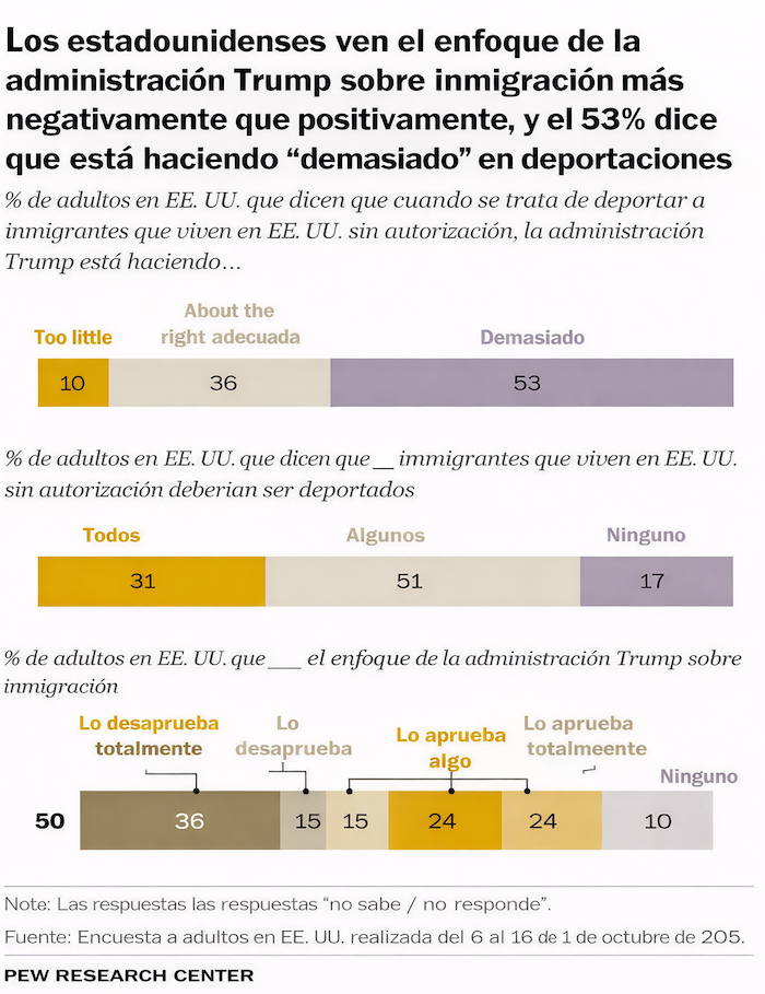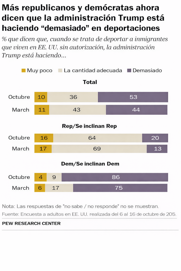 Pero uno de los aspectos más significativos del estudio es que el descontento también comienza a crecer entre los propios republicanos, ya que, entre quienes se inclinan por el Partido Republicano, el porcentaje que considera que el Gobierno hace “demasiado” en materia de deportaciones pasó de 13 por ciento en marzo a 20 por ciento en octubre. En contraste, quienes opinan que Trump hace “lo correcto” disminuyeron de 69 a 64 por ciento. En cuanto a la percepción de que se hace “muy poco” apenas se movió, al pasar de 17 a 16 por ciento.