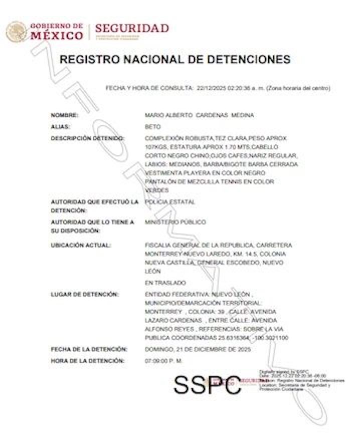 Ciudad de México, 22 de diciembre (SinEmbargo).- Autoridades del estado de Nuevo León detuvieron a Mario Alberto Cárdenas, alias "El Betito" y quien es sobrino del exlíder del Cártel del Golfo, Osiel Cárdenas Guillén. El arresto tuvo lugar el domingo en calles de la ciudad de Monterrey, según información del Registro Nacional de Detenciones (RND).